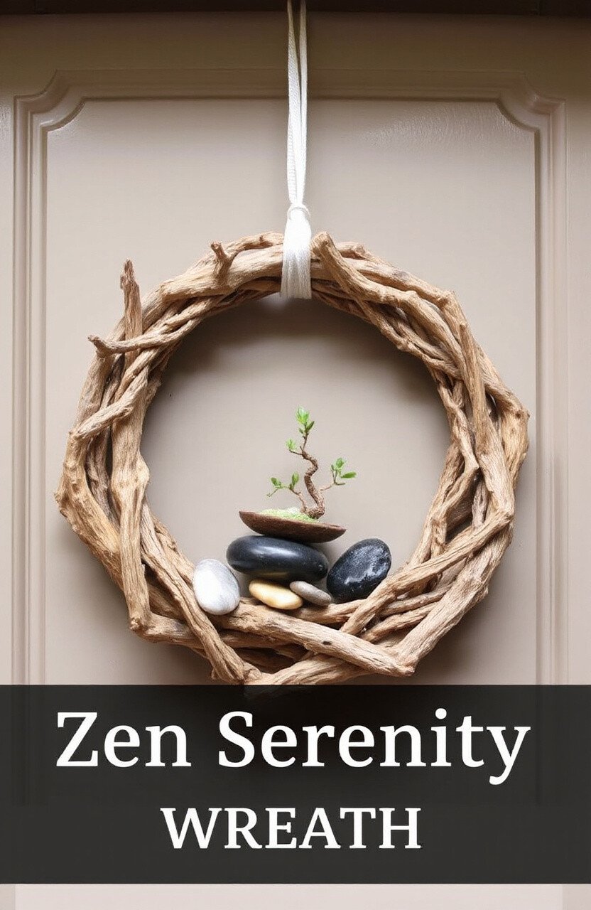 Promote peace and calm in your home with a Zen Serenity wreath. Use driftwood combined with stones and small bonsai elements for a soothing, natural look.