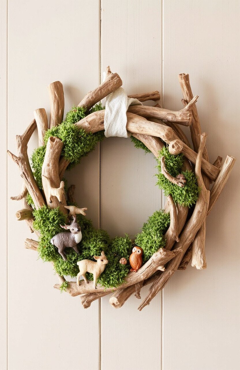 Create a magical Woodland Fantasy with a wreath that combines driftwood with moss and small woodland creatures. This design brings the enchantment of the forest into your home.