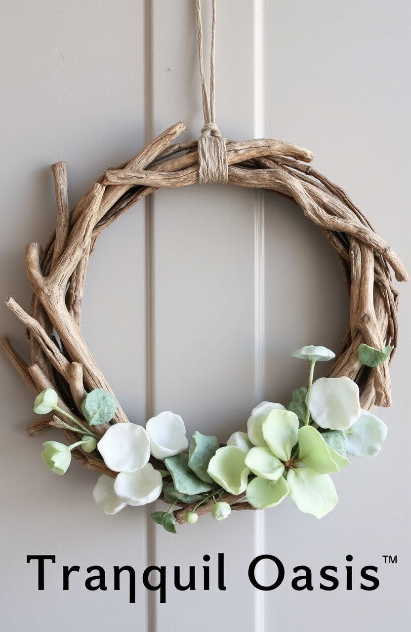 Create a calming Tranquil Oasis with a wreath that features driftwood and soothing elements like soft greens and blues.