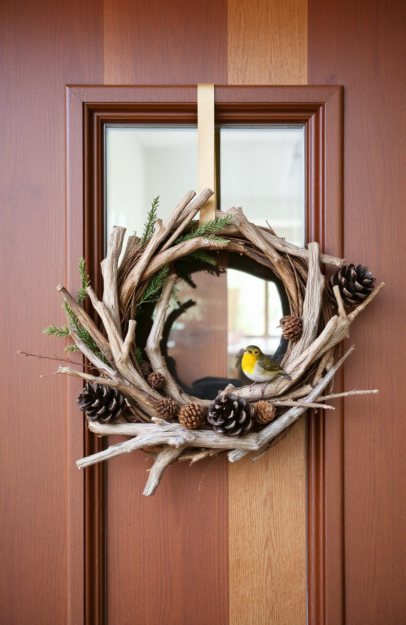 Experience the tranquility of a Forest Retreat with a wreath that combines driftwood, pinecones, and small branches. This design brings the beauty of the forest into your home.