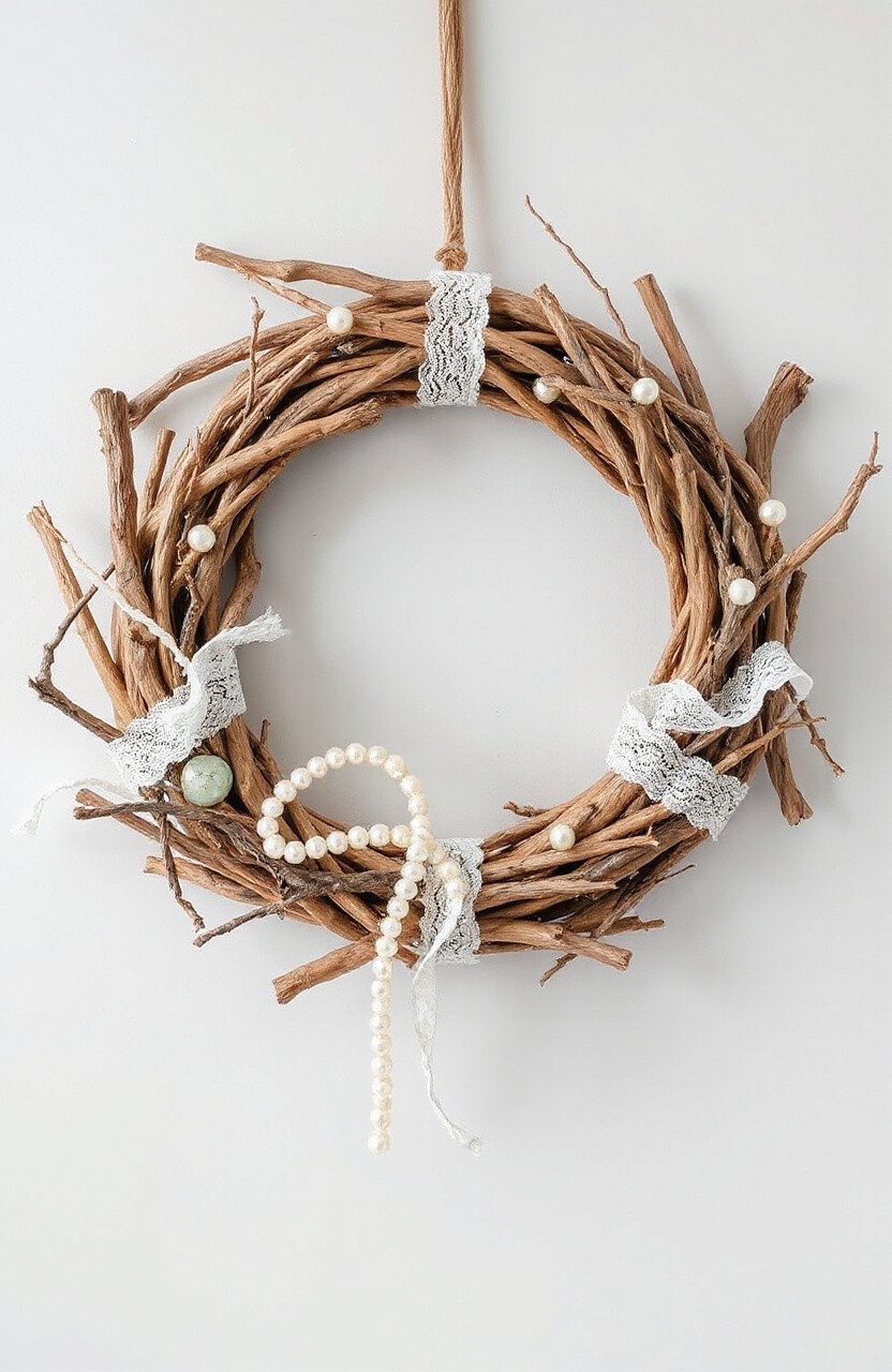 Embrace the enduring charm of Timeless Beauty with a wreath that features driftwood and classic elements like pearls and lace.