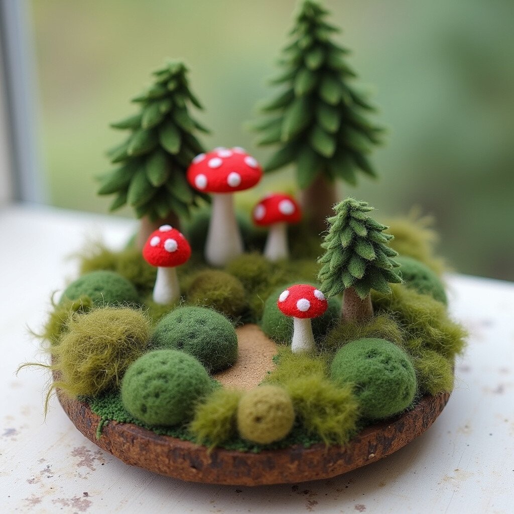 Create a miniature forest scene with needle-felted moss and tiny mushrooms. This idea is perfect for adding a touch of nature to your living room or workspace. The vibrant greens and earthy browns will make any space feel alive.