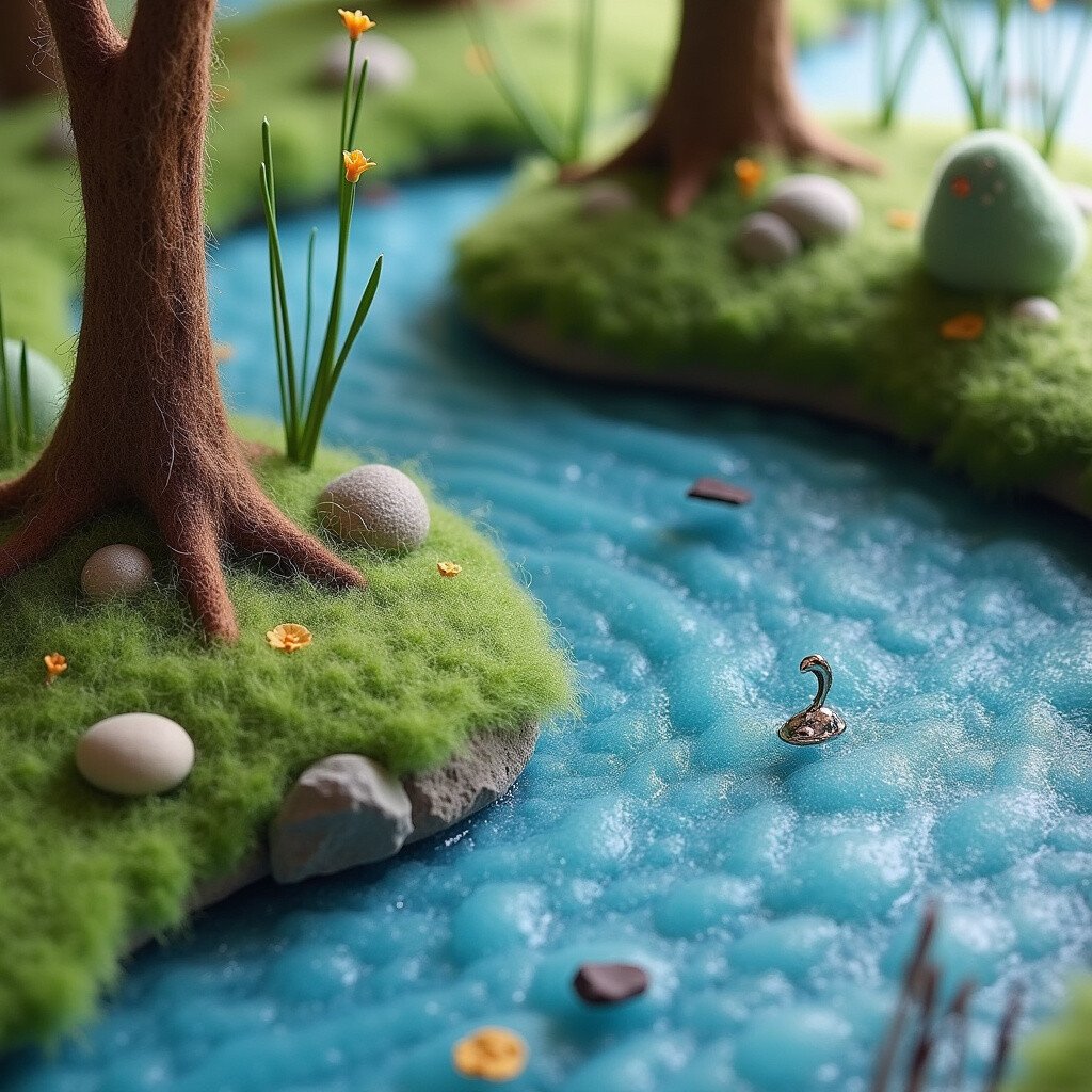 Add details like stones, reeds, and small animals. Use blues and greens for the water and plants. This project is a soothing reminder of nature’s gentle rhythms.