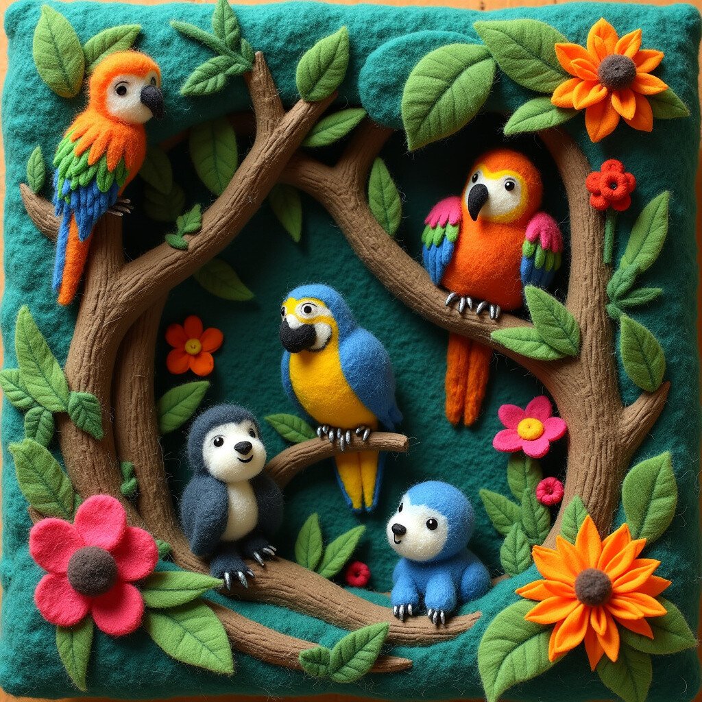 Design a lush rainforest canopy with felted trees and animals. This project is ideal for those who love the vibrant beauty of the tropics. The rich greens and colorful animals create a stunning display.
