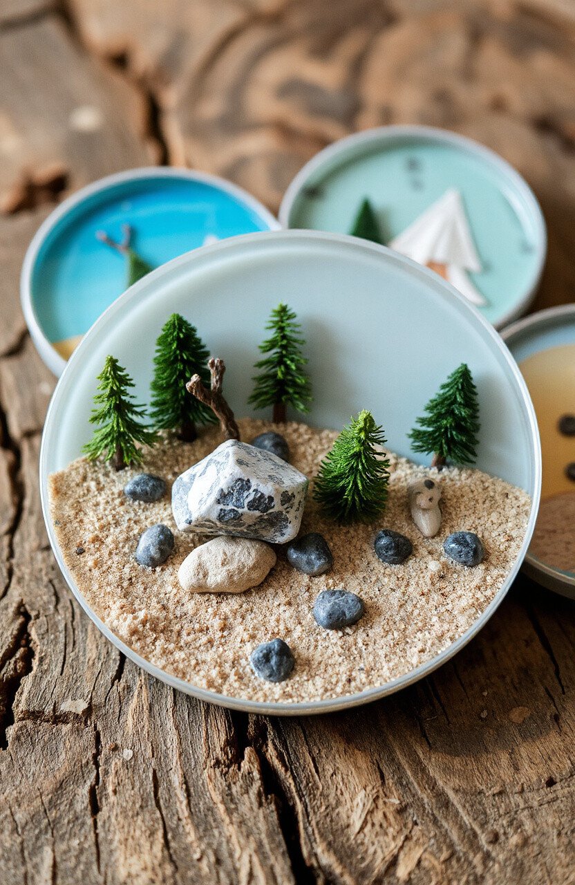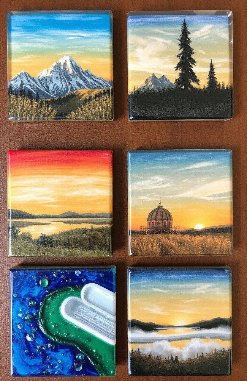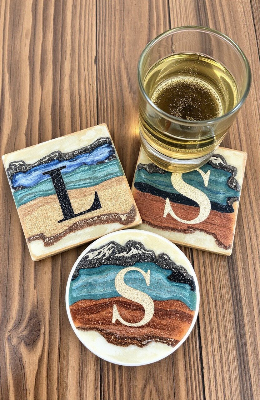 Capture the beauty of nature with coasters featuring mini landscapes. Use tiny trees, rocks, and sand to create scenes within the epoxy.