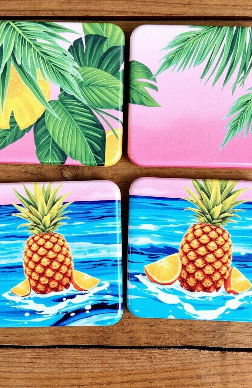 Escape to a tropical paradise with coasters that feature palm leaves, pineapples, and vibrant colors.