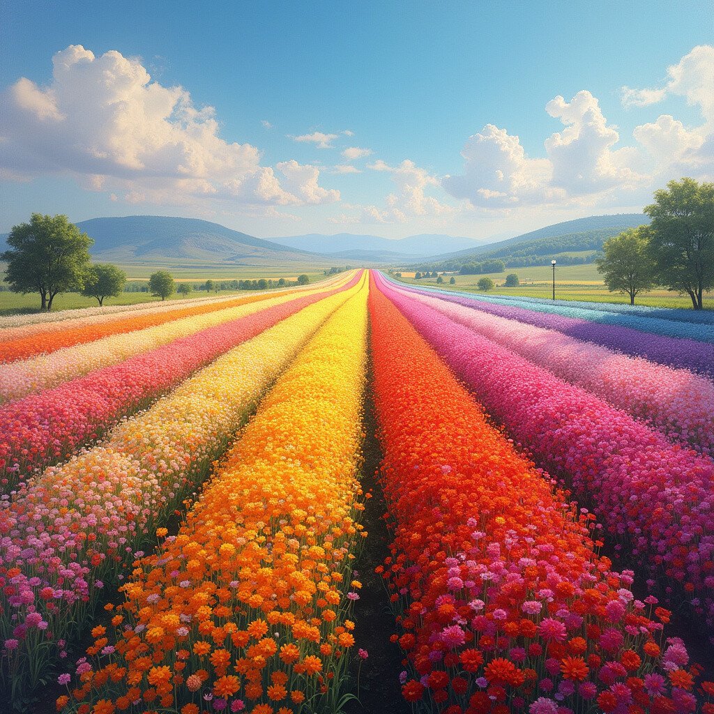Endless rows of blooming flowers create a sea of color. Flower fields are nature’s patchwork quilt.