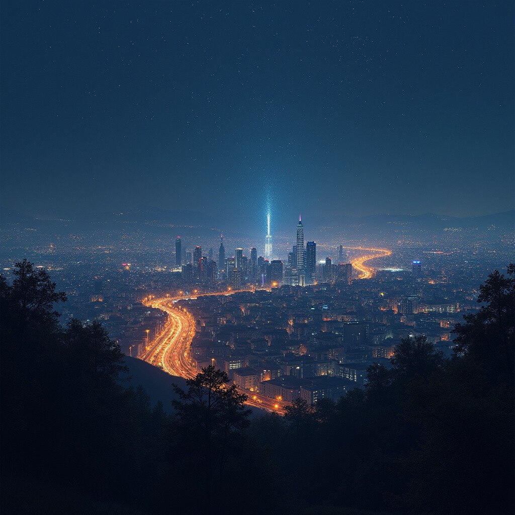 City lights twinkling against a dark sky create a vibrant energy. Nighttime cityscapes are full of life.