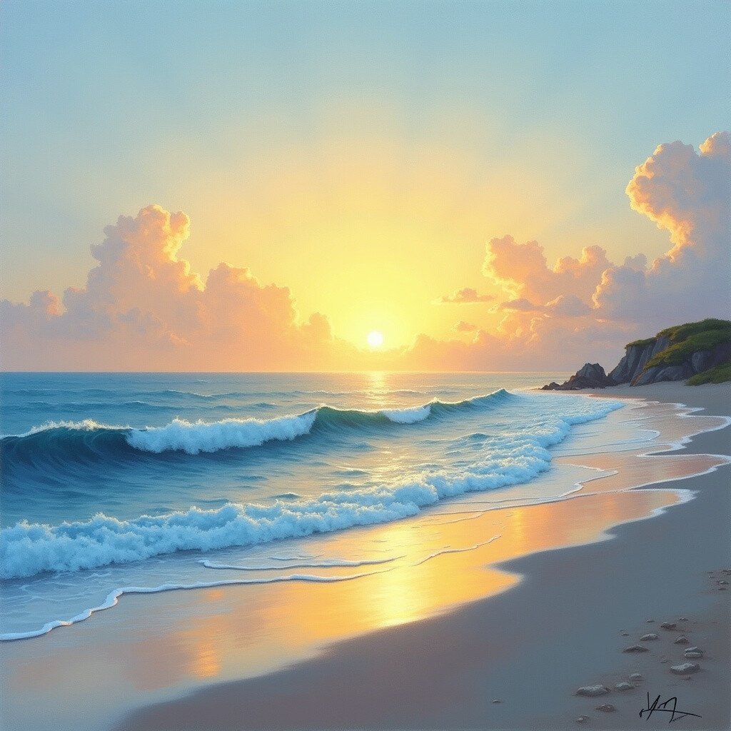 Experiment with soft yellows and blues for the sky. This scene is perfect for early risers and ocean lovers.