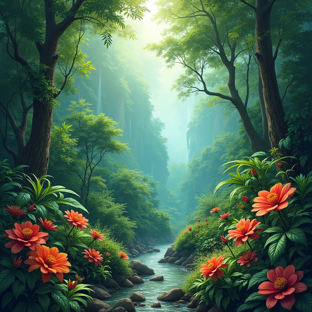 Dense, green foliage and vibrant flowers create a paradise of plant life. The rainforest is alive with color and sound.