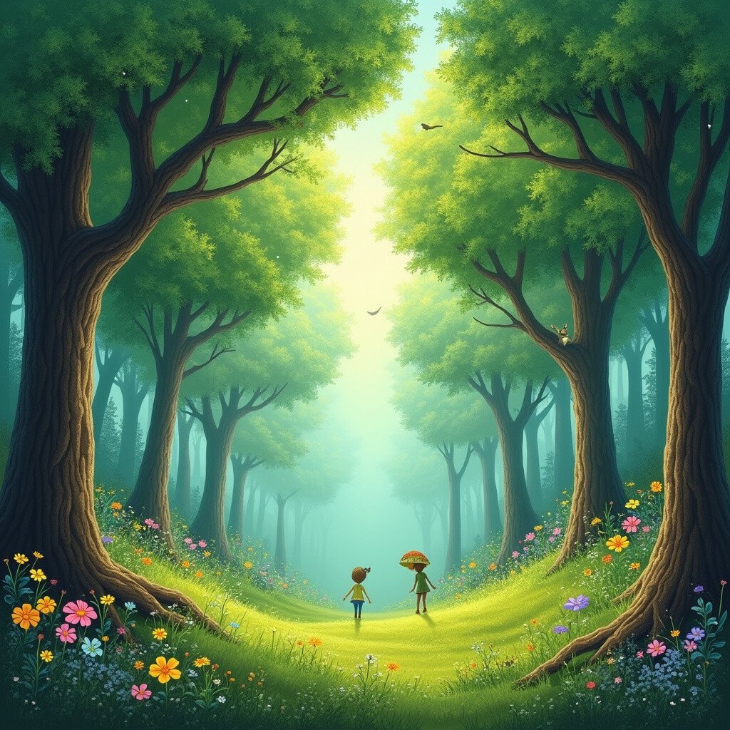 Whimsical trees and hidden creatures create a magical forest. Fairy groves are places of fantasy and imagination.