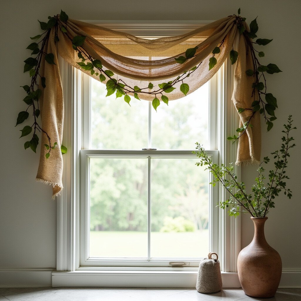 Create a swag with burlap and leaves to drape over your window. It’s rustic and charming.