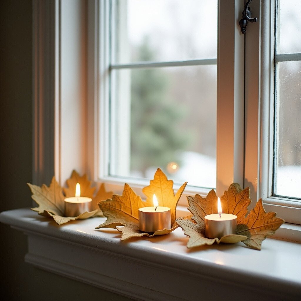 Use leaf-shaped candle holders on your window sill for a cozy glow. They add warmth and a farmhouse vibe.