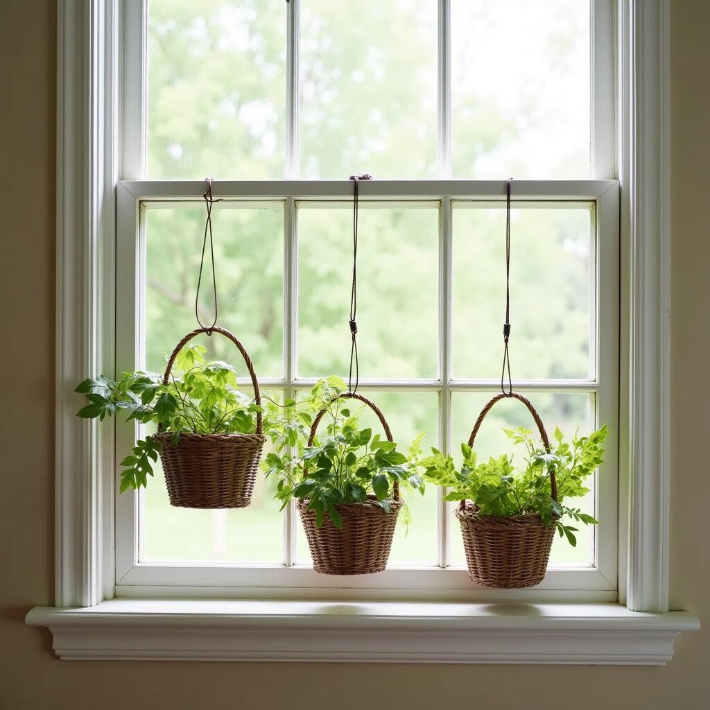 Use small baskets filled with artificial leaves to create hanging decor. Attach them to your window sill for a unique twist.