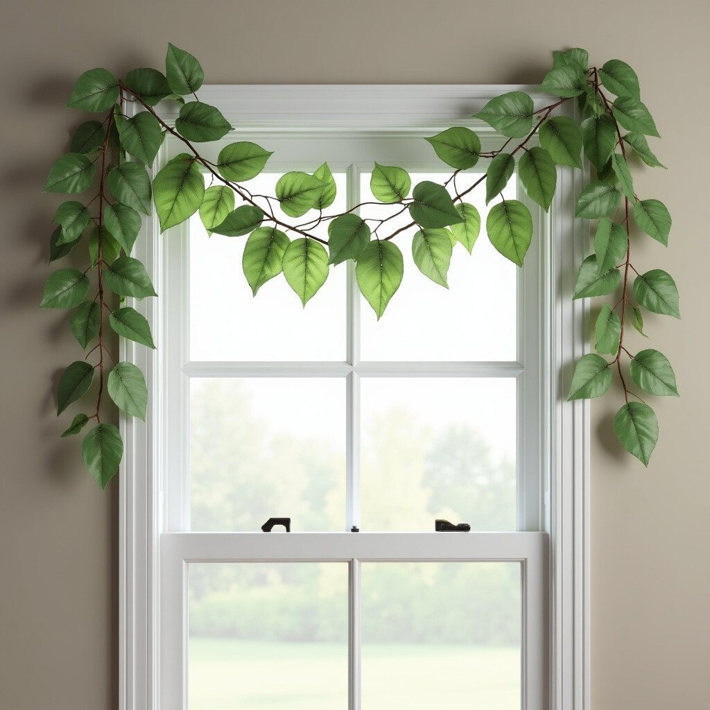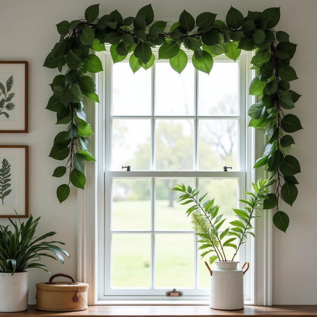 Crafting a garland with faux leaves can instantly add a touch of farmhouse charm to your window. The garland drapes effortlessly, creating a sense of flow and movement.