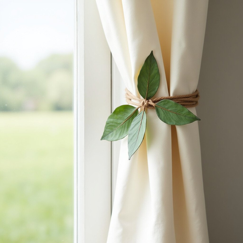 Use twine and faux leaves to create charming curtain ties. They add a subtle farmhouse flair.