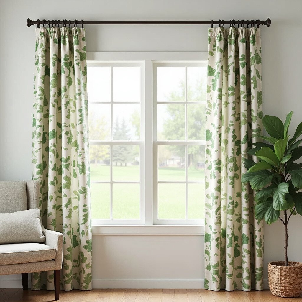 Choose curtains with a leaf pattern to complement your farmhouse theme. The prints bring a lively, natural feel.