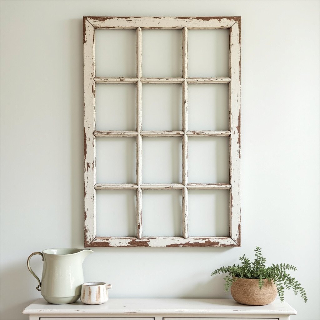 Old window frames can become beautiful wall art with a bit of creativity. They add a touch of nostalgia and can be used to frame photos or small objects. The wood’s aged look brings an authentic farmhouse feel to any room.