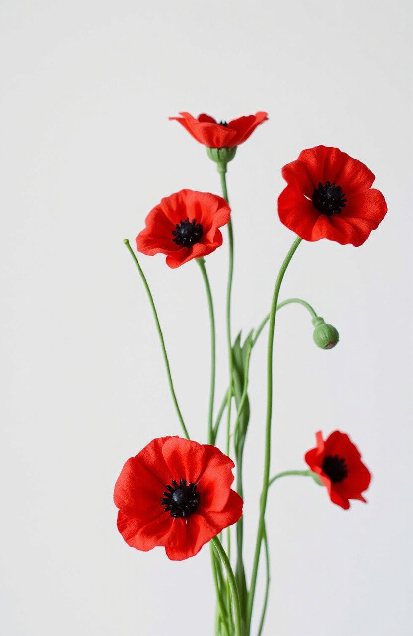 Poppies are bold and beautiful. Their red petals and black centers make for a striking felt flower.