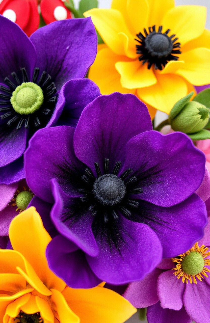 Anemones are unique and eye-catching. Their dark centers and bright petals make them a favorite in felt crafting.