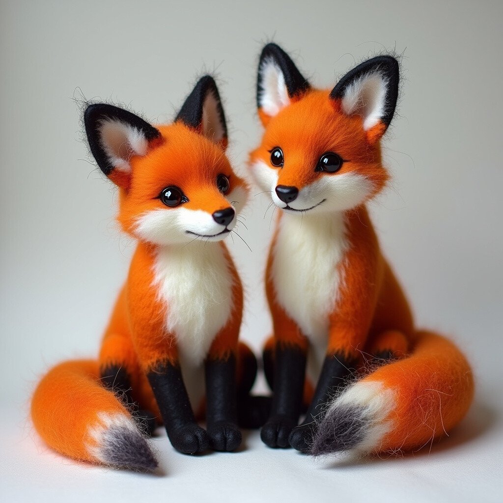 Use rusty orange and white wool to create their iconic look. Position them sitting with bushy tails for a realistic pose.