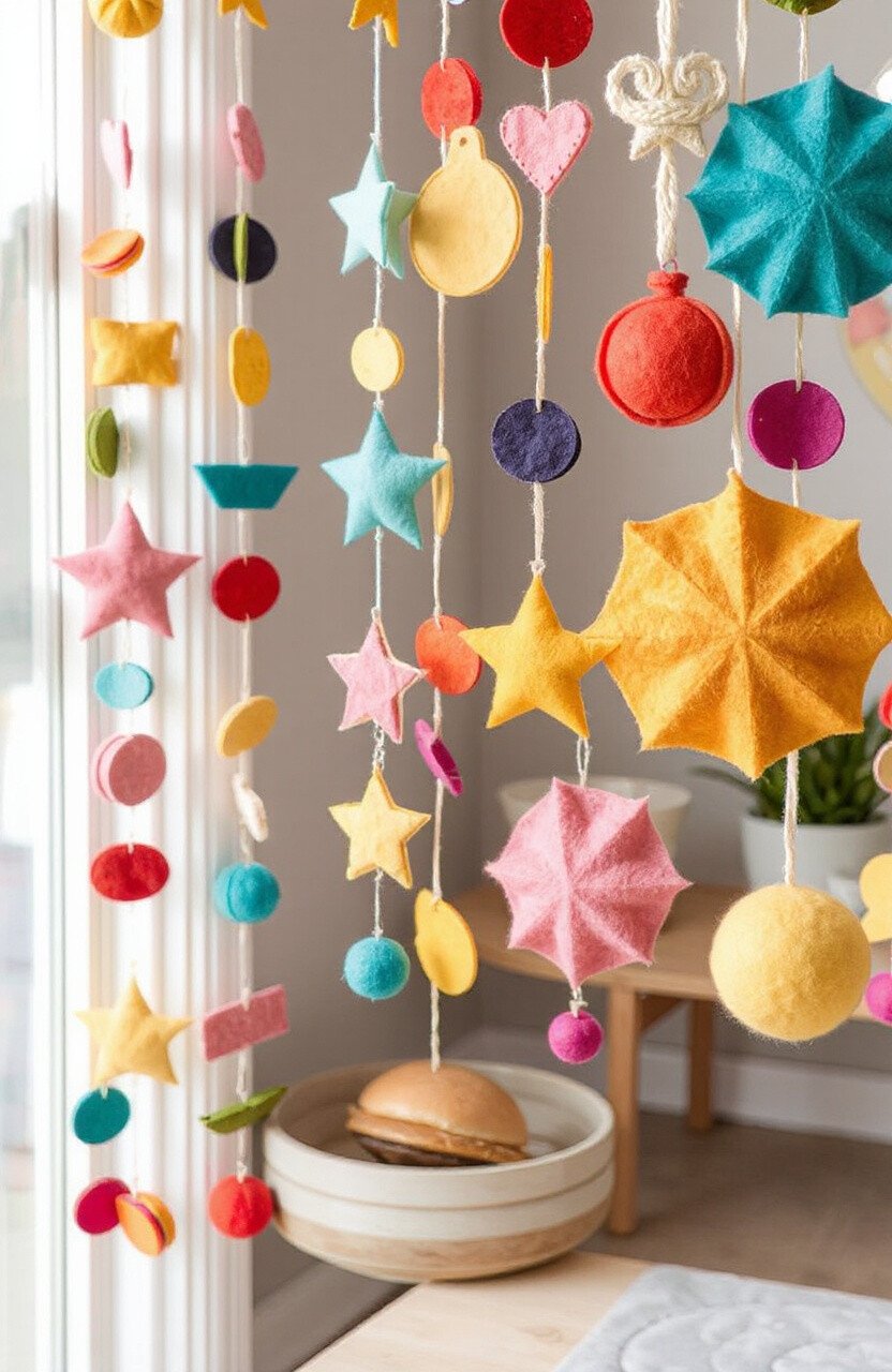 Felt garlands are soft, colorful, and bring a cozy feel to any space. Cut felt into shapes like stars or circles, string them together, and drape them around your home.