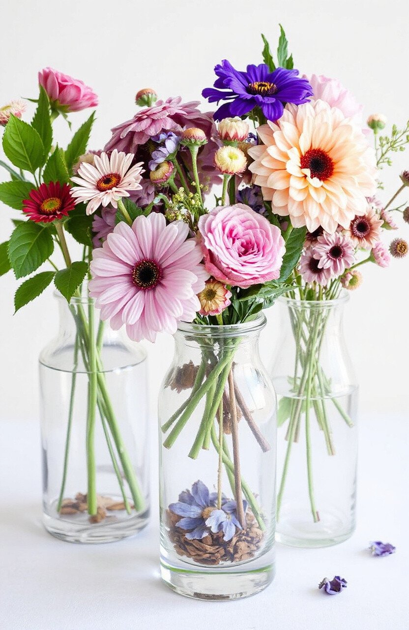 Fill clear vases with pressed flowers for a chic look. Use them as centerpieces or decor. A fresh take on traditional flower arrangements.