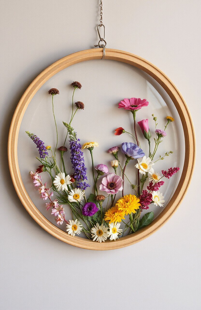 Craft a wall hanging with pressed flowers. Use a wooden or metal ring as a base. Hang it in your living room or bedroom.