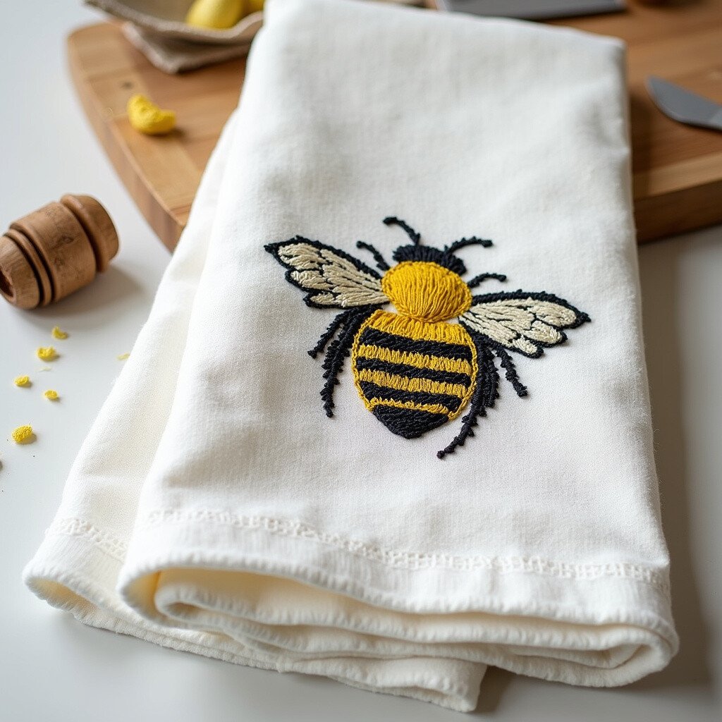 Embroider tiny bees onto kitchen towels to add a touch of charm. Use yellow, black, and white threads to stitch the bees onto the fabric. These towels are both decorative and functional, perfect for drying hands or dishes.
