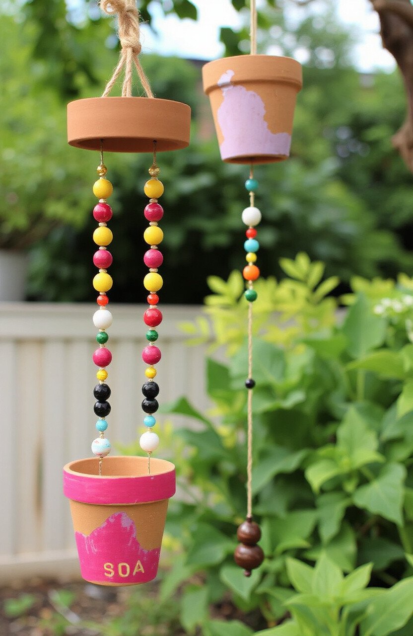 Assemble small clay pots and paint them with bright colors. Add beads and string to create musical wind chimes. Hang them in your garden for a touch of whimsy.