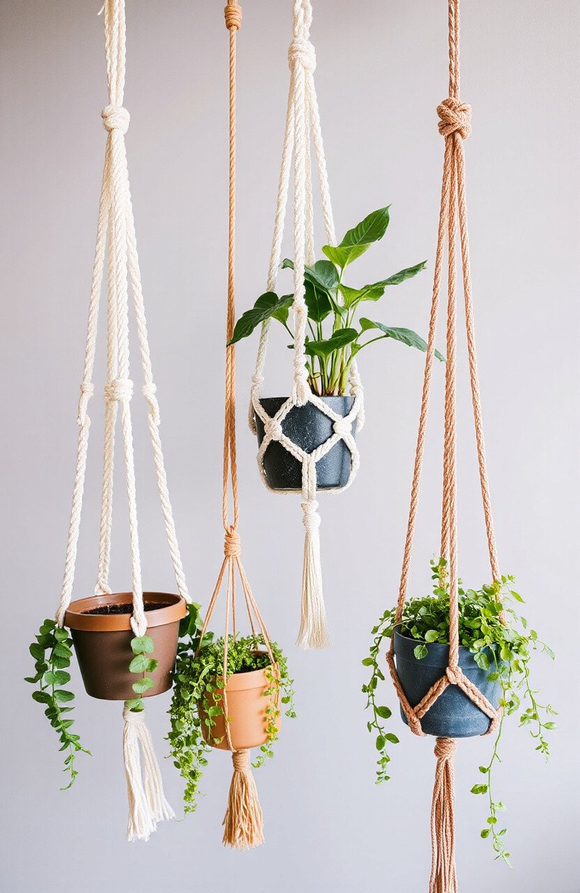 Macramé plant hangers are a stylish way to display plants. Use different knots and ropes to create eye-catching designs. Hang them to save space and add a boho vibe.