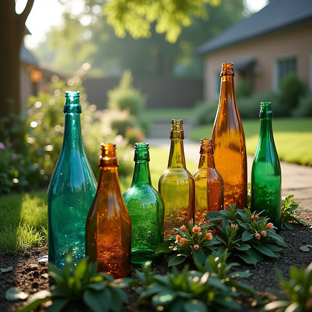 Glass bottles can be used to create beautiful borders. Bury them neck-down along paths or flower beds. The glass catches sunlight, adding sparkle.