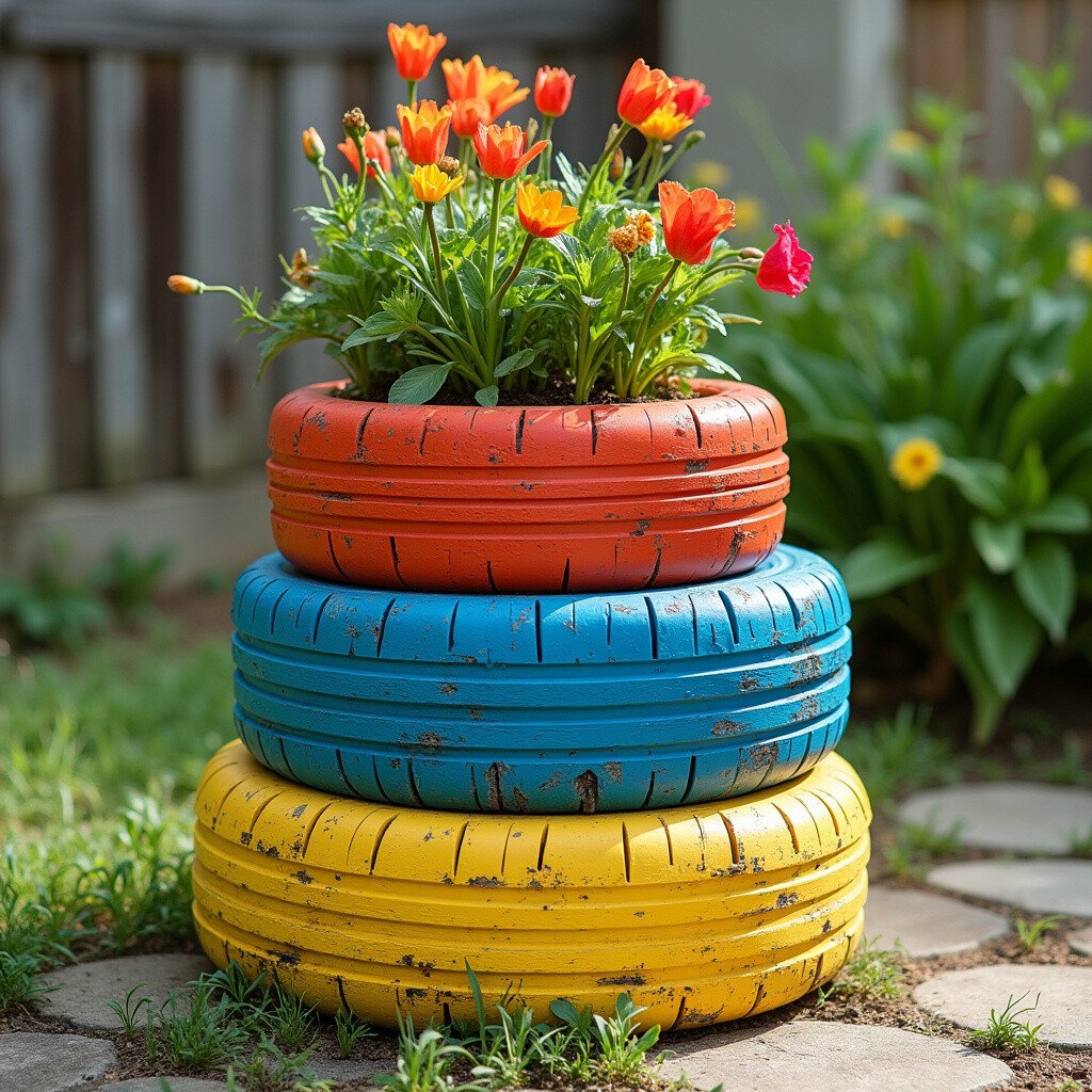 Old tires can be transformed into vibrant planters. Paint them with bright colors and stack them for a layered effect. They make perfect homes for flowers or herbs.