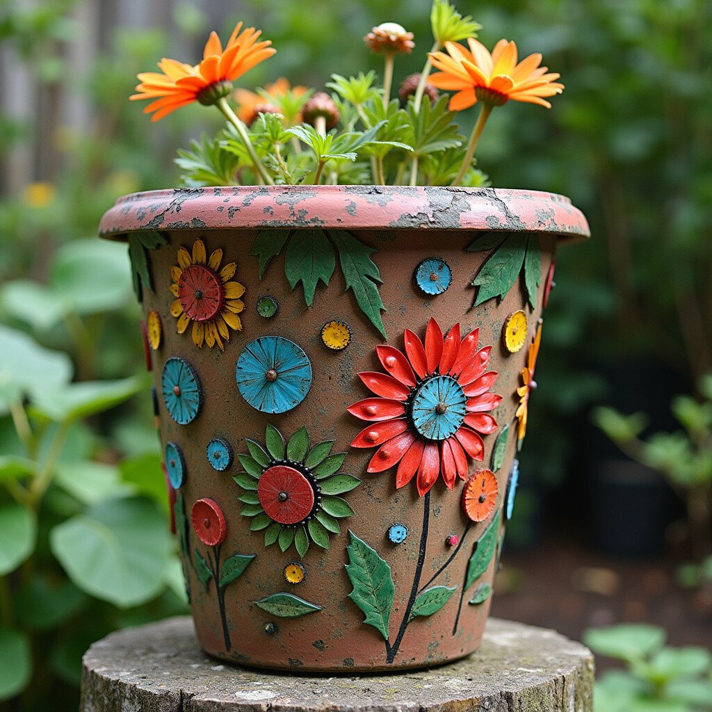 Save those bottle caps! They can be turned into colorful garden art. Use them to create mosaics or decorate plant pots.