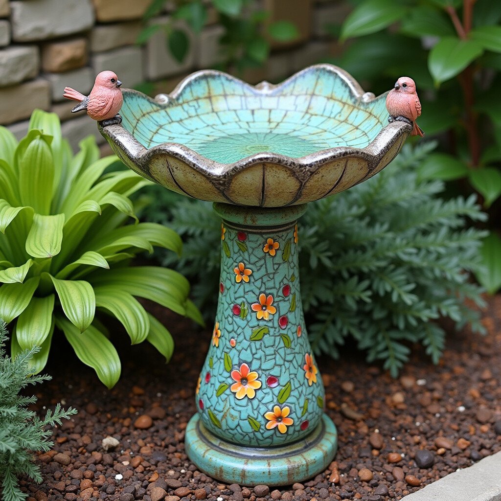 A birdbath can be a piece of art. Use a large leaf, concrete, or an upcycled bowl. Decorate it with tiles, stones, or paint.