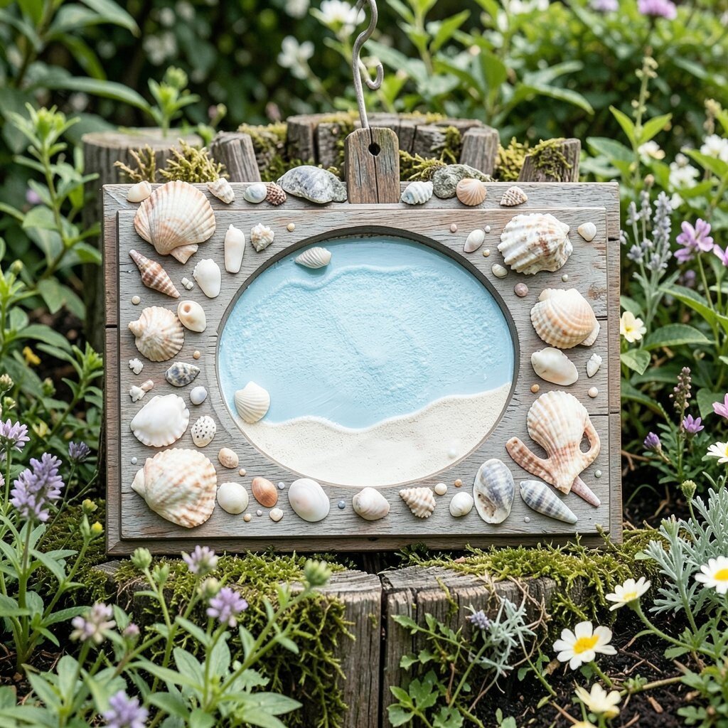 Craft garden plaques with seashells for a beachy vibe. Arrange them in patterns or use them to frame a central design, bringing a touch of the ocean to your garden.