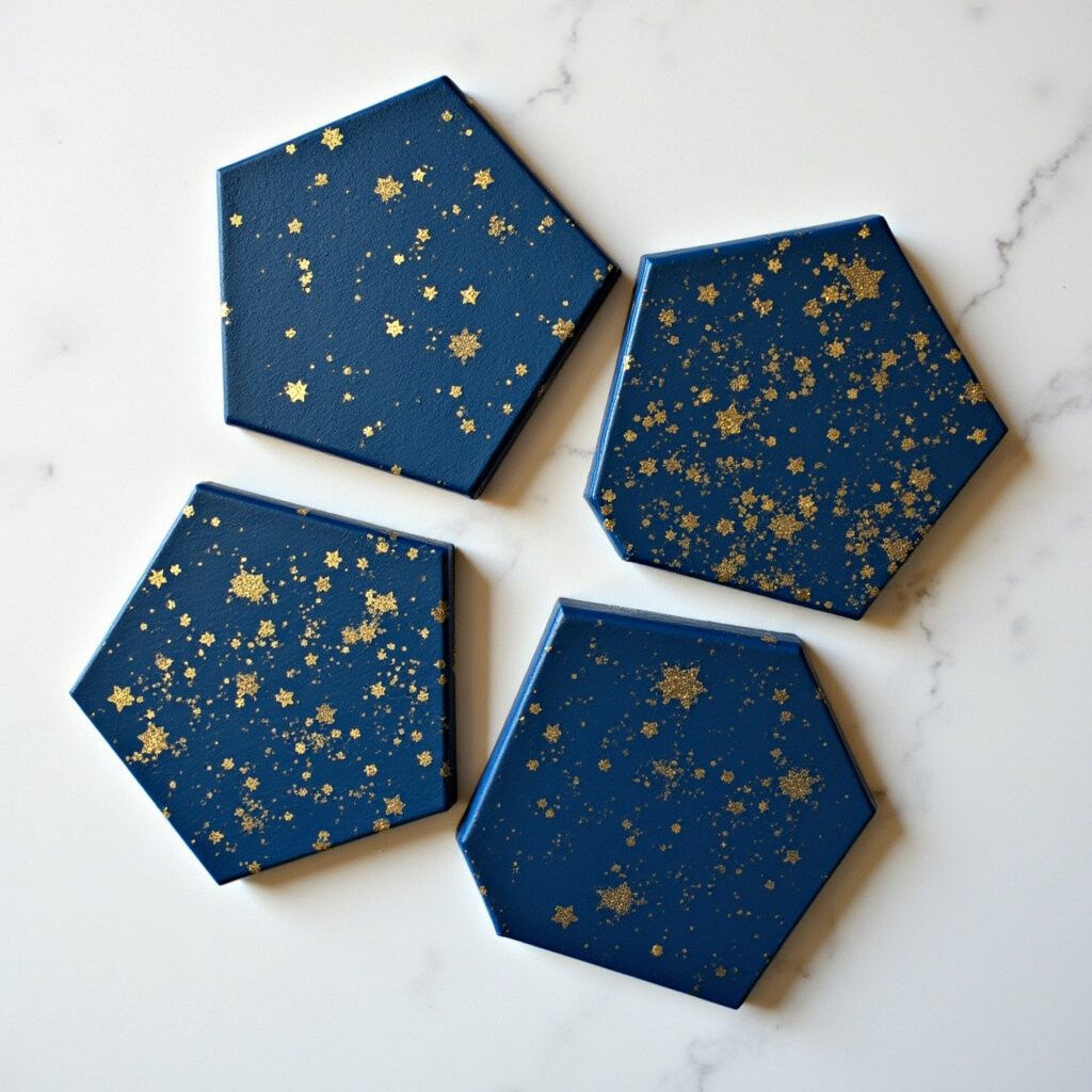Imagine the twinkle of a starry night captured in a coaster! These hexagonal coasters use dark blue and gold paint to mimic that magical sky. They’re perfect for adding a mystical touch to your Christmas party.