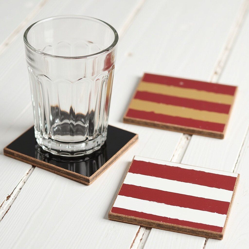 For a modern twist, striped rectangle coasters add a sleek look to your décor. Use contrasting colors like black and white or red and gold for a striking effect.
