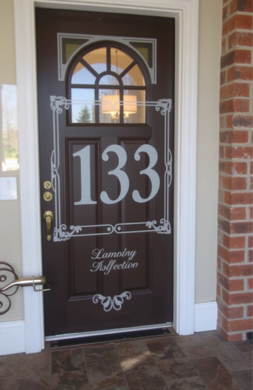 Etched glass door plaques offer a stylish way to display names or numbers. Simple fonts or decorative borders work well.