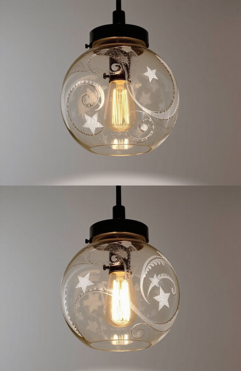 Etched glass light fixtures create beautiful effects when lit. Patterns like spirals or stars enhance the ambiance.