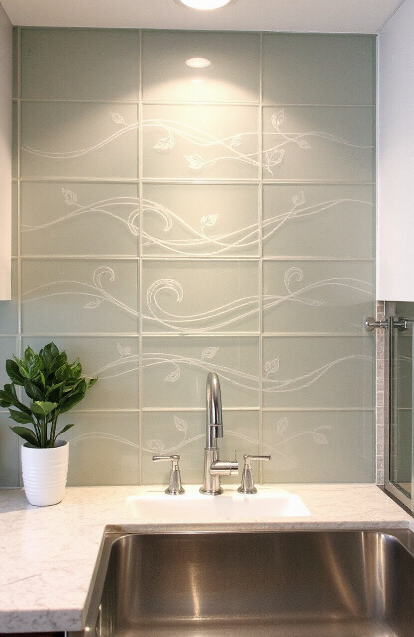 Etched designs on glass tiles can be a stunning backsplash or accent. Patterns like waves or leaves add interest.