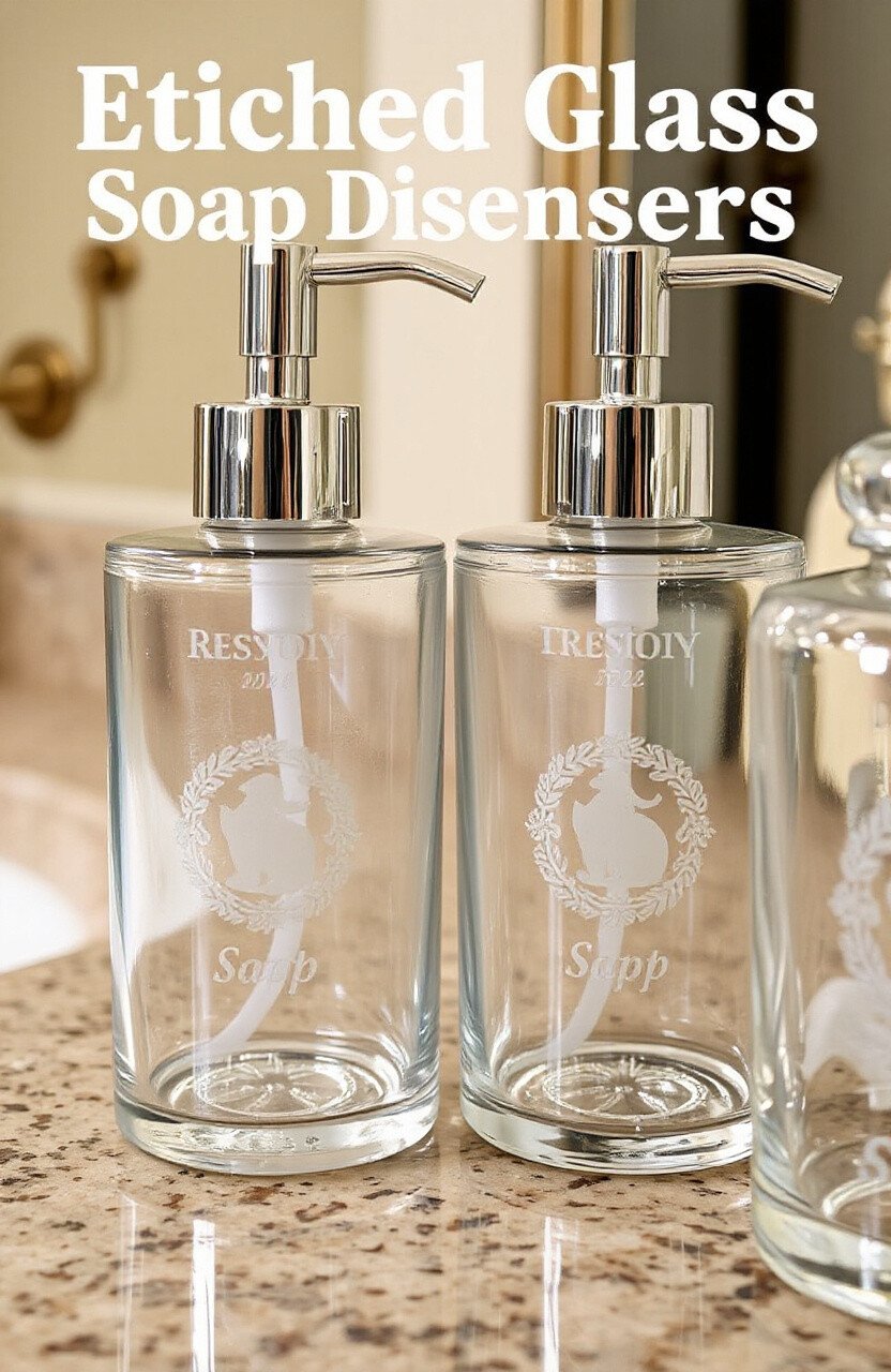 Add a touch of luxury to your bathroom with etched soap dispensers. Customize them with elegant patterns or simple labels. They’re practical and elevate your bathroom decor.