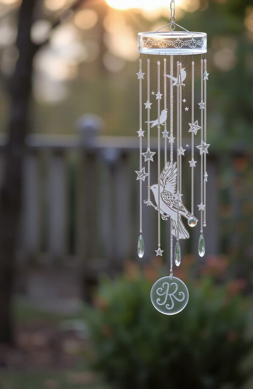 Create soothing sounds with etched glass wind chimes. Each piece can be detailed with motifs like birds or stars. They bring music and beauty to outdoor spaces.