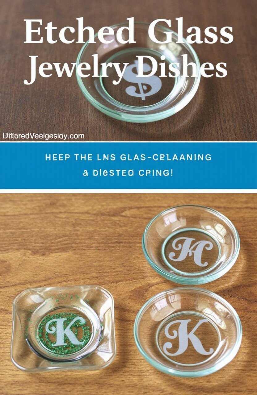 Keep your jewelry organized with etched glass dishes. Customize them with initials or motifs that reflect your style. They’re not just practical; they’re a chic addition to your dresser.