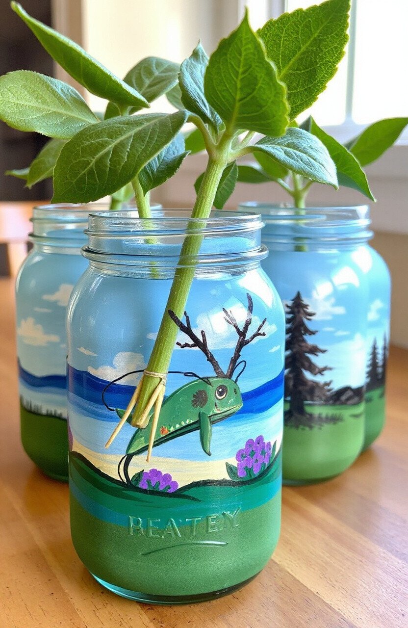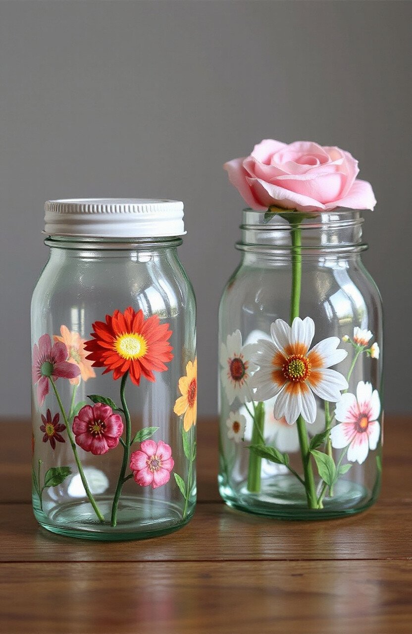 Adorn glass jars with delicate floral patterns to add a touch of nature to your decor. This idea is perfect for spring or summer, bringing the beauty of blooming flowers indoors. Each jar can feature a different flower, adding variety and interest.