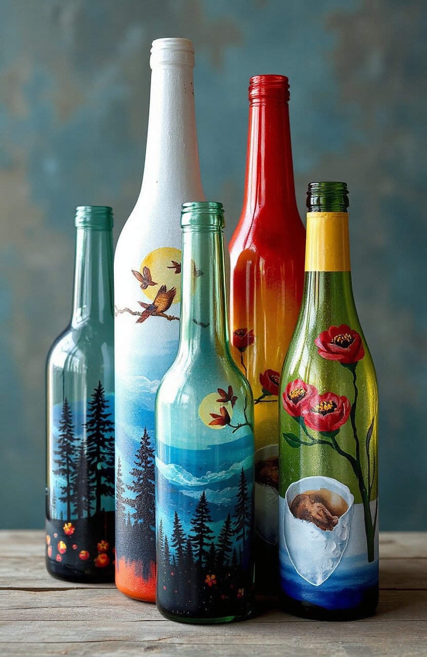 Try painting a series of bottles with complementary colors for a cohesive look. This is an affordable project, as you can repurpose old bottles and use inexpensive glass paints. Enjoy experimenting with different styles, from abstract designs to realistic scenes.