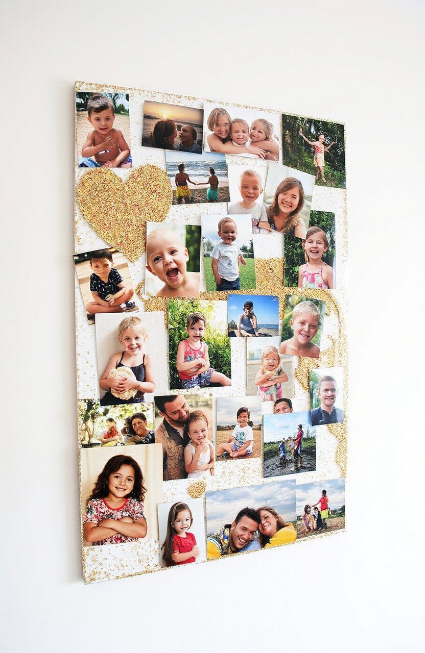 This idea is perfect for a living room or hallway. Arrange pictures in various shapes and sizes, then add glitter to highlight special ones. The cost is minimal, making it a fun and affordable project.