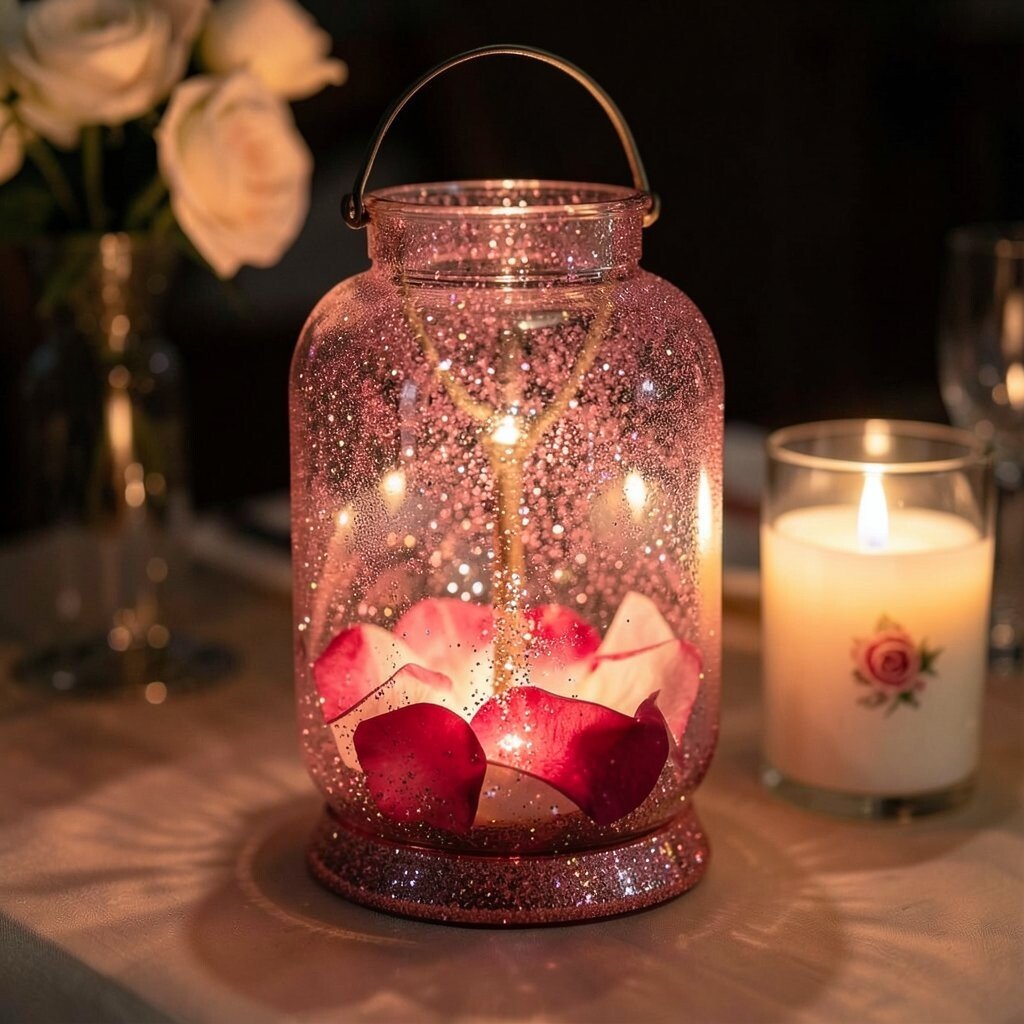 For a touch of romance, create a lantern filled with soft pink and red glitter. This gentle color palette casts a warm, inviting glow perfect for intimate settings. Pair it with a rose-scented candle to amplify the romantic vibe.