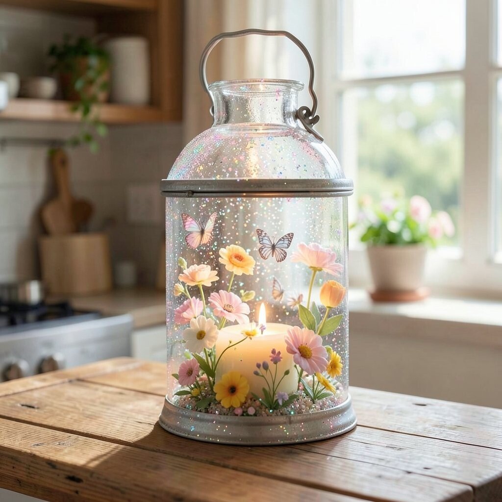 Turn your home into a blooming garden with a lantern filled with pastel-colored glitter. Add faux flowers and tiny butterflies inside for a fresh, spring-like feel. This lantern brings the joy of a garden into any room.