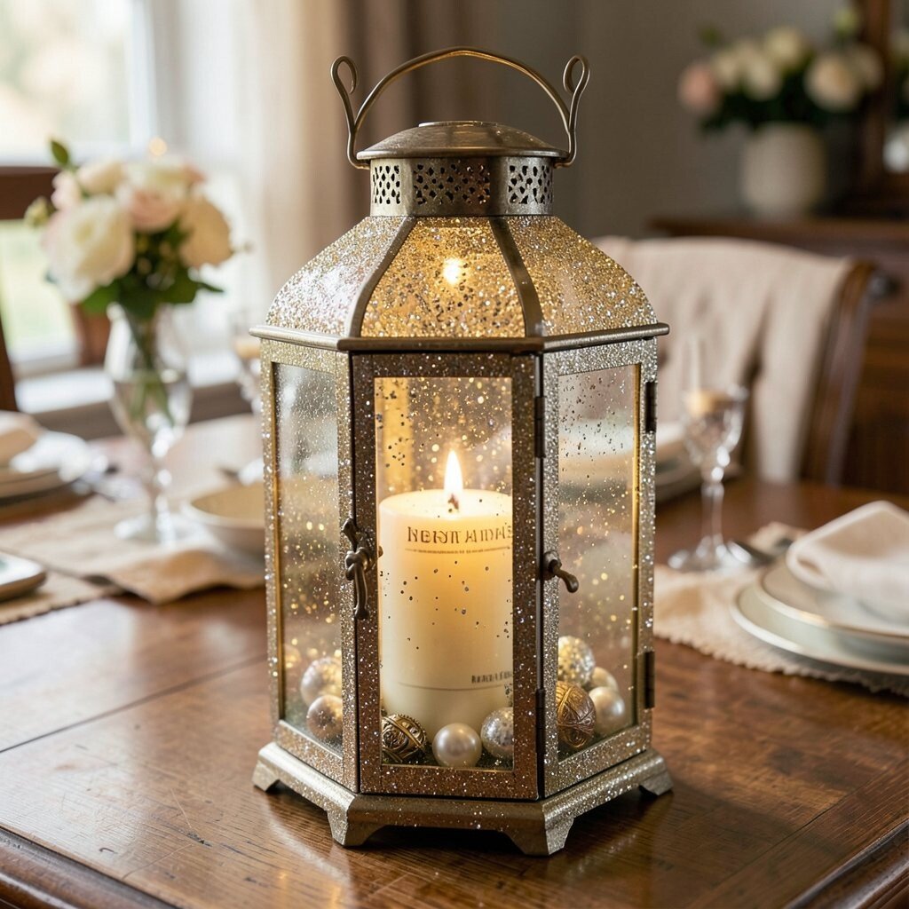 Bring a touch of vintage elegance to your home with a lantern filled with gold and silver glitter. Add pearls or small vintage trinkets inside for a classic, timeless look. This lantern exudes glamour and sophistication.